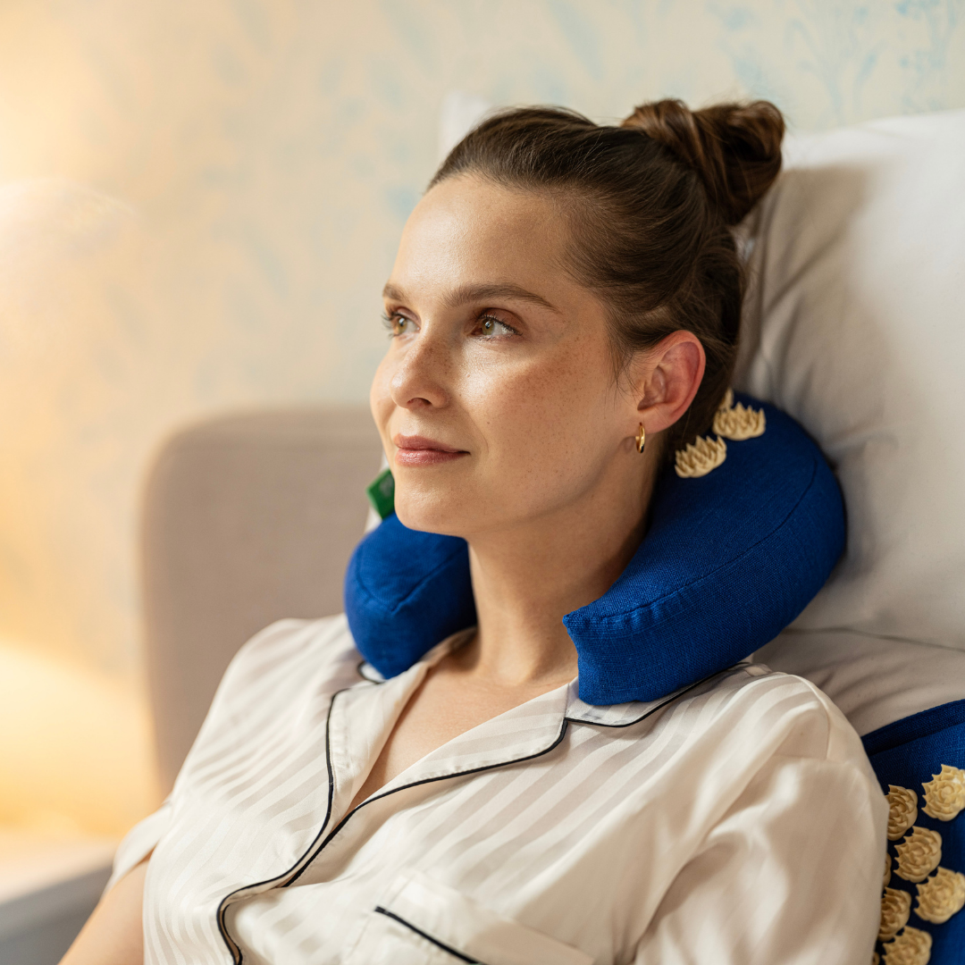 Le Coussin Lune sur la nuque — le moyen le plus rapide de relâcher la tension des épaules et d'apaiser l'esprit.